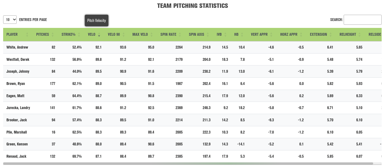 This screenshot of Team Pitching Statistics provides a solid snapshot of what a fair expectation for velocity might look like at the Division 1 (D1) college baseball level. While pitching velocity is often a hot topic in recruitment and development, this chart allows for a more grounded, realistic view of where many D1 arms sit and how much variation exists even within a single team.